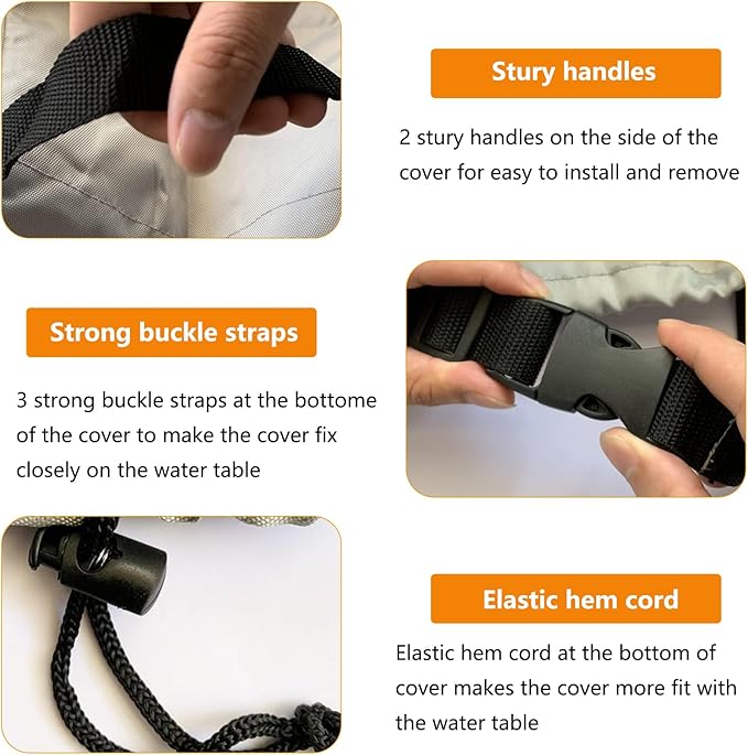 - 【Easy to use and store】-There has 2 strong handles on the side of the water table cover for easy to install and remove.And we also provide a zipper bag to store the cover when not in use