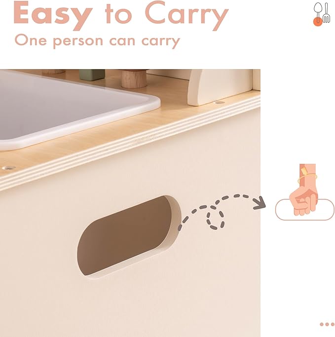 - Hands-On Fun & Learning: Create an interactive world with our Wooden Play Kitchen! Touch-sensitive controls on the back spark imagination, letting your child play chef with simulated cooking. The temp dial? It's not just fun, it teaches heat levels! This hands-on play boosts brainpower, making learning a blast!