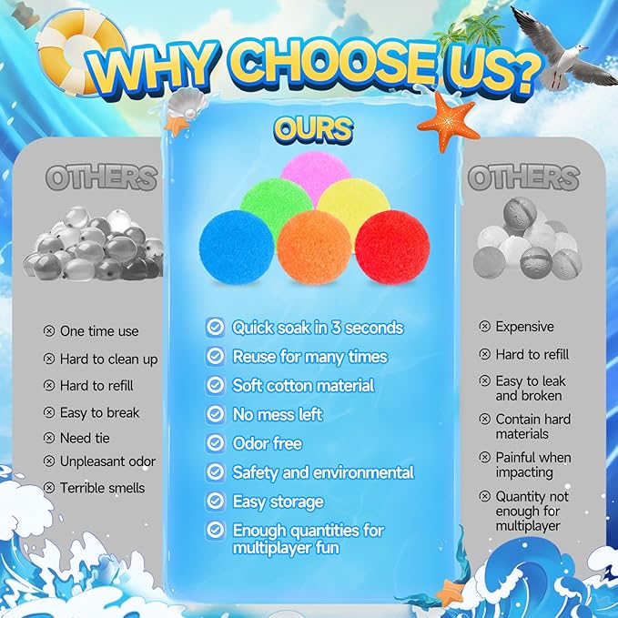 - Soft Material: These water balls for kids are made of quality PP cotton, soft and comfortable, absorbent quickly, reusable and washable, not easy to deform, which can be use for a long time; The reusable water balls are brightly colored, suitable for many people for a water fighting game.
