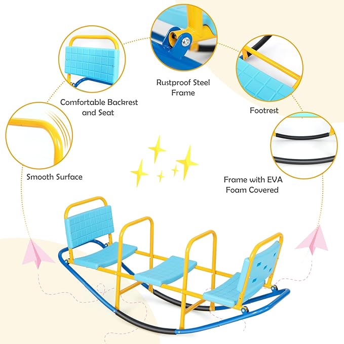 - Built for Comfort and Safety: Composed with ergonomic backrests and large seats, this kids rocking seesaw makes your children feel comfortable sitting on. At the same time, there are 2 smooth handlebars for your kids to grip in order to give the sense of security while rocking.