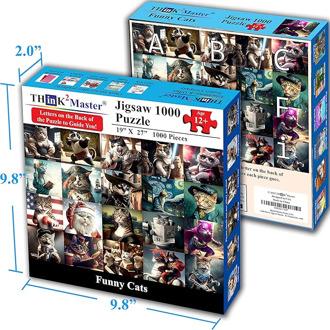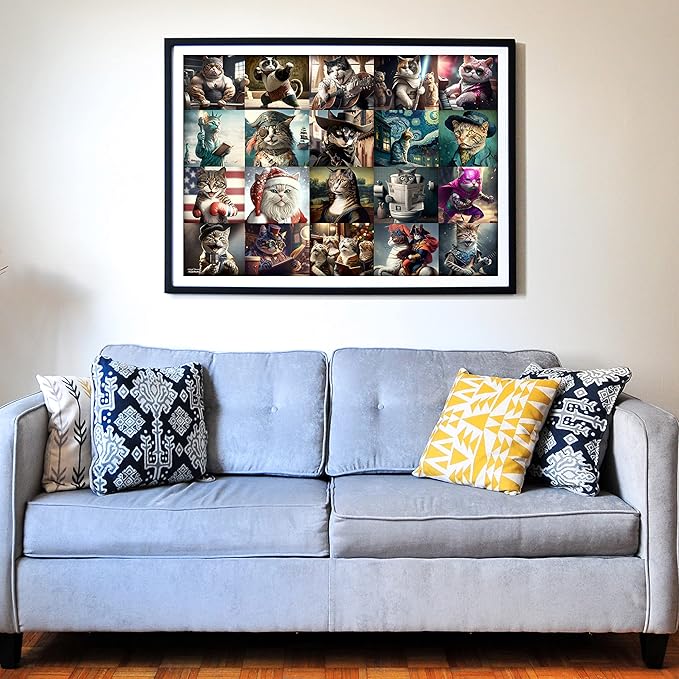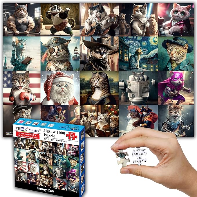 - 【Funny Cats】 - This puzzle is perfect for cat lovers and puzzle enthusiasts alike, with its brilliant colors, high-quality pieces, and 20 adorable cats including Shorthair, Ragdoll, Turkish Angora, American Curl, British Longhair, Bobtail and Ragamuffin. These furry friends are in adorable outfits including Superhero, Mona Lisa, Rock Star, Santa, Boxer, Zoro, Van Gogh, Statue of Liberty. They are also participating in incredible activities such as Boxing, Martial Arts and Pooping.