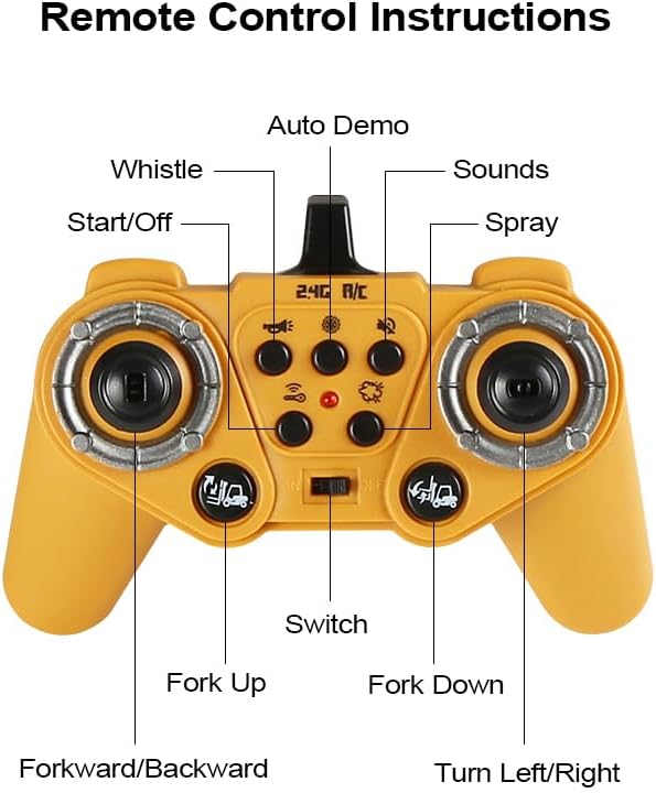 • 11 Channel RC Forklift: Forklift can go forward & backward, turn left & right, forklift pallet up & down, simulation sounds & lights, spraying, one key demo.