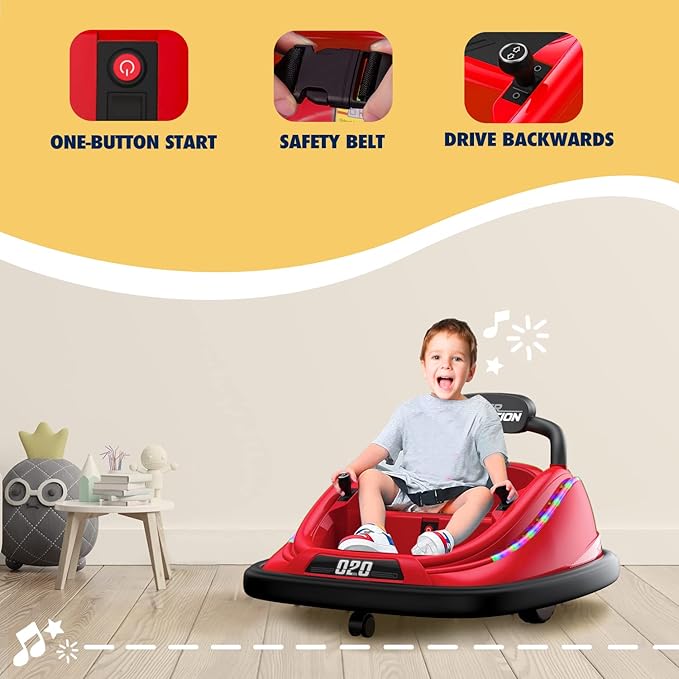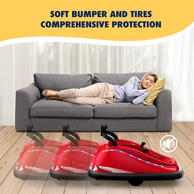 • GIFT FOR BOYS&GIRLS: This bumper car is a perfect addition to interactive and group games. Kids can bump each other for more riding fun. And this bumper vehicle has a music player, LED flashlights, and a horn suitable for kids to ride even at night. It is a perfect gift for boys and girls.