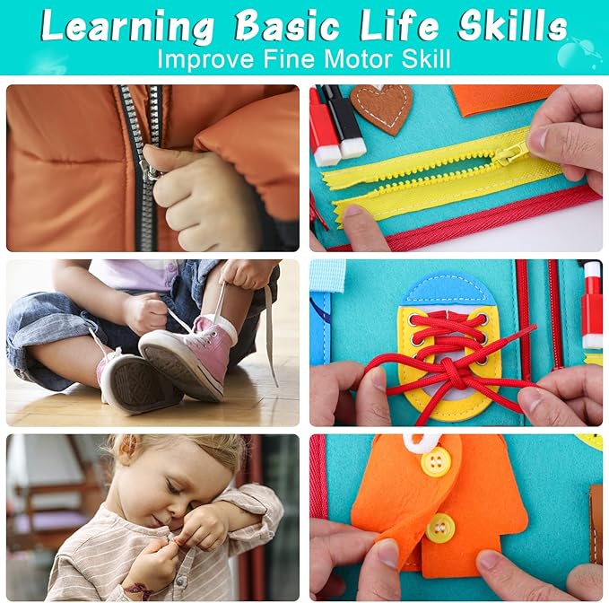 - MONTESSORI SENSORY TOYS - FASTSPOK sensory busy board for 1-3 year olds, allowing children to learn basic life skills such as zippers, shoelaces, buttons, belt buckles, which helping children improve their fine motor skills, finger dexterity, creative thinking skills, and problem solving skills