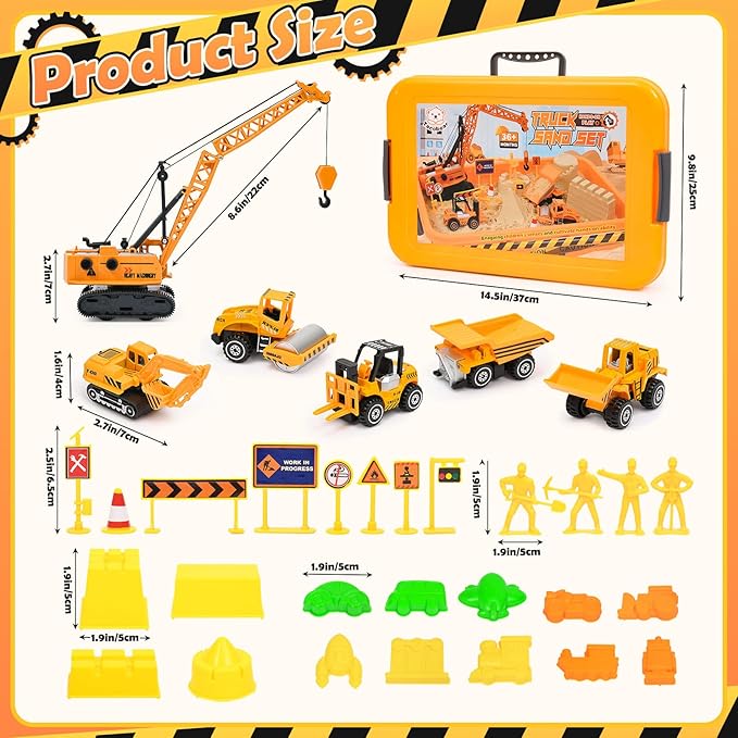 - 【Super Luxurious 39 Pcs Construction Sand Playset】---This toddlers play construction sand playset includes 3.1 lbs sand+5*construction vehicles+a towel crane+8*worker figures+8*road signs+14* sand model + a sandbox+an exquisite box. Let your kids to realize construction engineering dreams. Your kids will have much fun in building it