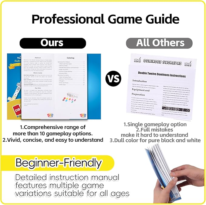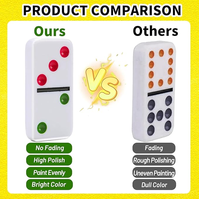 - *DELICATE &DURABLE TILES: Our domino tiles are well made with nice workmanship and the dots are clear and easy to read. Besides,the domino tiles are made from durable and safe materials that are high in hardness and not easy to wear out. Tiles are specially designed as arc angles instead of sharp corners to protect people from being scratched