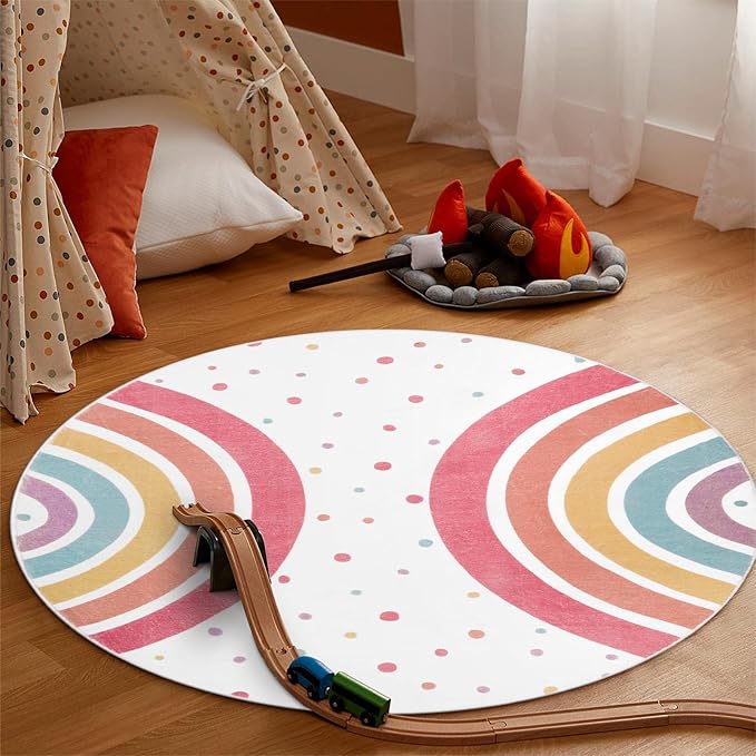 STARUIA Round Rainbow Rug for Girls Bedroom, 4 Ft Washable Kids Rug for Baby Nursery, Non-Slip Circle Area Rug Colorful Princess Carpet for Teen Dorm Playroom Tent