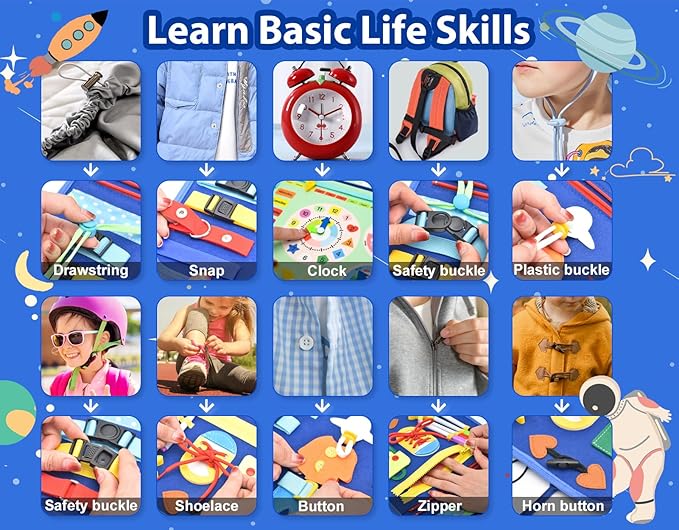 - Multi-functional Montessori Busy Board:Montessori Busy Board feature multiple function including zippers,shoelaces,buttons,shapes,food,clock,colors,seasons,weathers,fruits,vegetables,animals,letters,numbers and more, plus a unique DIY mode,your kids won’t lose attention that quickly like others.Safe preschool learning activities for quiet play that help children learn naturally through play. Develops fine motor skills, dressing skills, finger dexterity and cognitive skills