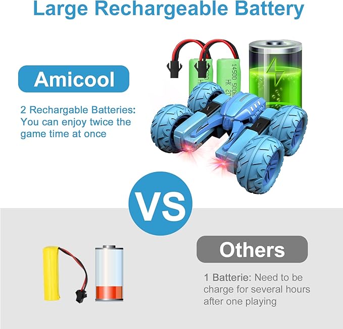 - Double Sided RC Stunt Car 360 Degree Spins & Flips】: Double sides running, Forward, reverse, left & right turn / retreat, left & right 360° spinning, fancy roll. Give you different playing experience with this toys for boys. Drift driving stunt needs skilled operation, gives daddy or mummy opportunity to play toy cars with your 6/7/8 years old girl or boy