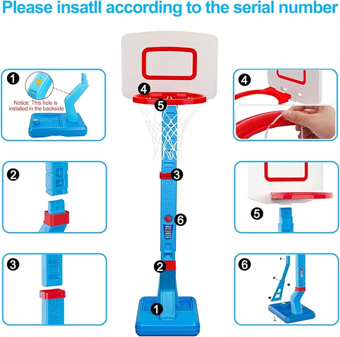 - Easy to Install: Our basketball hoop game set comes with basketball board, basketball hoop net, 4 small inflatable basketballs with different color, pump, stand, base and other accessories. Very easy to install and assemble. It is a great outdoor toys for toddler 1-3 and kids ages 3-5
