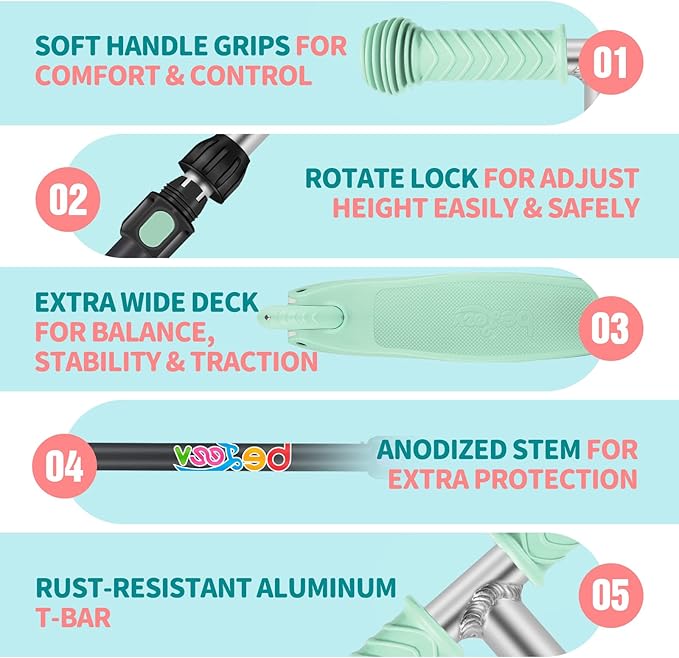 - ๐ดTurn and Stop with Ease: The 3 wheel scooter utilizes a Lean-to-Steer system, kids use their body weight to safely steer, making steering a breeze. It helps children build up their coordination, balance, and motor skills as they ride. A foot brake with built-in stainless steel on the back wheel that even young kids can use with ease, effectively slow down and stop the scooter safely, avoid falls and accidents.