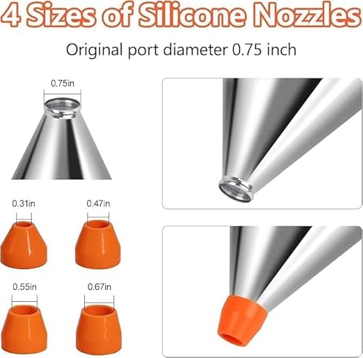 - Package Include: You will received 1 pcs stainless steel pancake batter dispenser,1pcs stand and 4 silicone mouths: 0.31'', 0.47'', 0.55'', 0.67'' and the mouth of the dispenser itself is 0.75''. Meet your various of demands for.