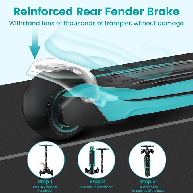 - 【Safe and Durable】 The progressive braking system prevents the scooter for kids ages 6-12 from rolling over due to sudden braking. The aluminum alloy reinforced frame, high-strength structural and SUV-level 5.11'' widened pedals allow the actual bear weight 110lbs(higher than similar products). The built-in stable triangular structure prevents rollover, bringing your kids a smooth and safe ride experience.