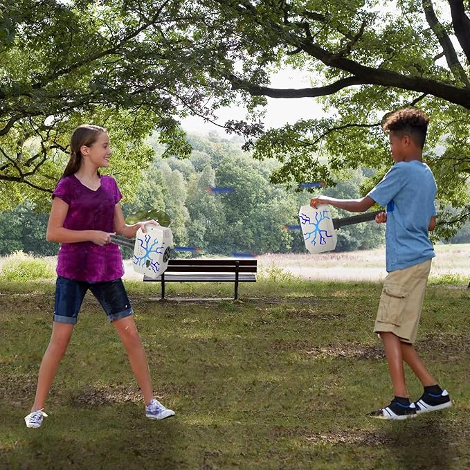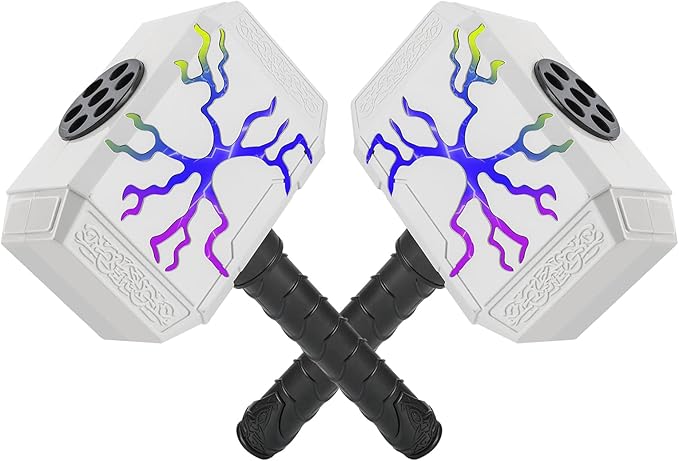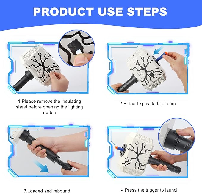 • 【Dart-Blaster Hammer】Charge into action and blast the competition with darts! The Thunder Hammer has a capacity of 7 darts and fires one dart at a time. (Note: Only the center hole is the firing hole; the other holes are for storing extra darts. The speaker on the product is for decorative purposes only and does not produce sound.)