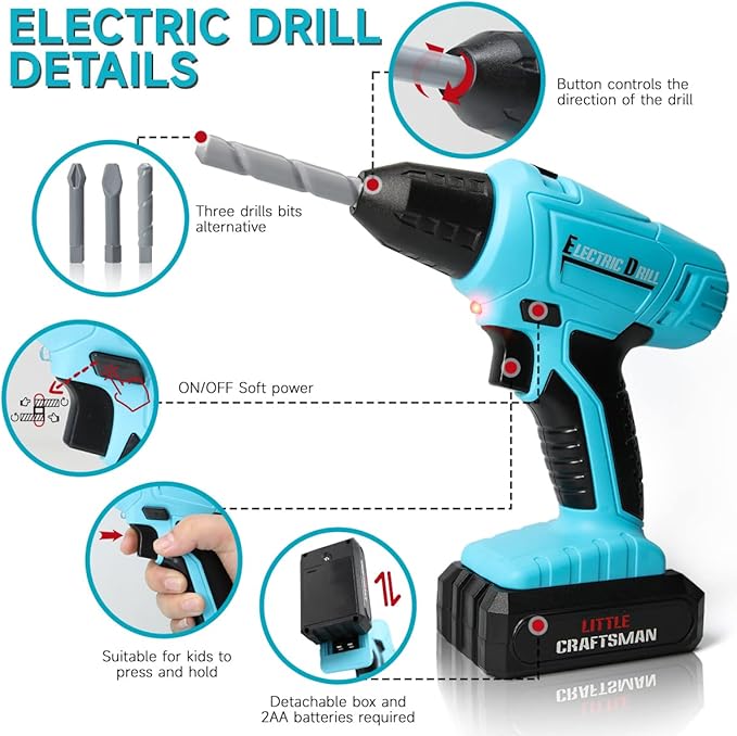 - 50-piece LOYO toddler tool set is a great introduction to basic building skills for little bulider. Features 3 IN-1 power toy drill with sound effects like real tools and movement, realistic-looking toy hammer, hand saw, screwdriver, wrench, kids tape measure, 6 screws, 6 nails, 6 nuts and some wood block and more for practice, everything is fully functional and realistic.