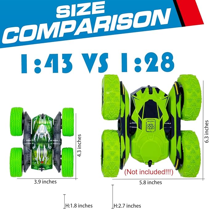 - 1:43 SMALL RC STUNT CAR: CAR SIZE:4.3 x 3.9 x 1.8 inches; That can be put in your bag,and taken out anytime and anywhere to play. In addition to the basic skills that ordinary remote control cars should have, the car can tumble in place at 360 degrees and drive on double sided. When the car encounters a small obstacle, use the remote to make the car roll or double-sided driving can easily pass obstacles, this function can also suddenly reverse in fast motion to make the toy car instantly turn into a dance car.