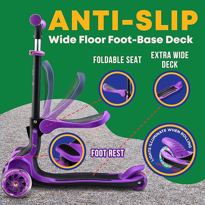 - KIDS SCOOTER: Our 2in1 kick scooter offers a standing ride option and a sitting option thanks to the integrated folding seat. The 3-wheel kick scooter design offers premium stability on long-lasting, super smooth gliding wheels that flash when moving!