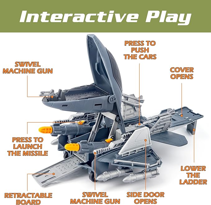 • Realistic Details: The heads and tails of military jet aircraft can be opened. The missiles can be fired by pressing. The gun can be rotated and the board can be retractable. These realistic details bring more happy time for children. There are more details to explore.