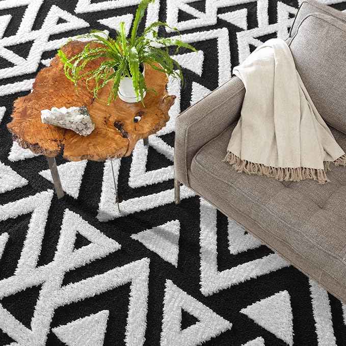 - Eye-catching design - fuzzy geometic rug showcases a beautiful and bold line design, which is a geometry lover’s dream; The surface of the thick pile that hardly falls off is made of high-low flat weave with raised, cut patterns for a delightfully textured feel