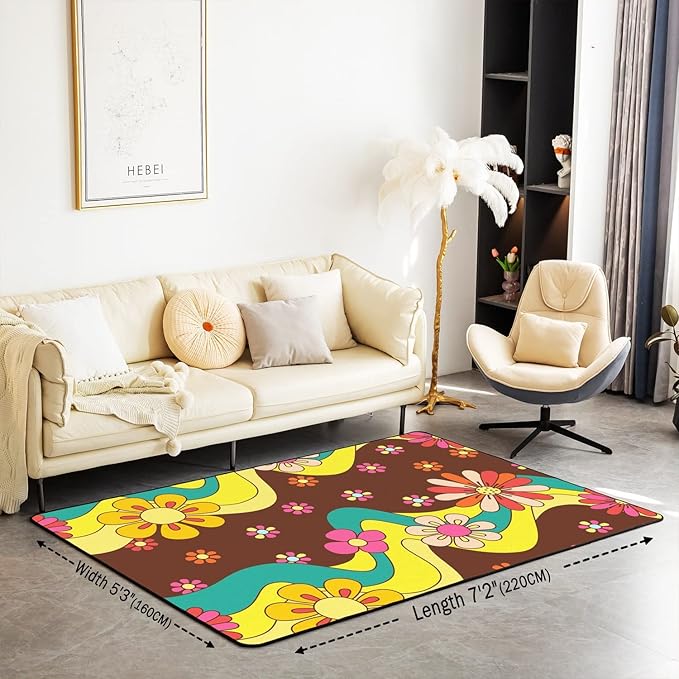 Erosebridal 70S Groovy Flowers Area Rug 5x7 Psychedelic Hippie Flower Carpet Groovy Floral Decorative Rug for Kids Girls Teen,Cute Boho Wavy Aesthetic Non Shedding Indoor Floor Mat