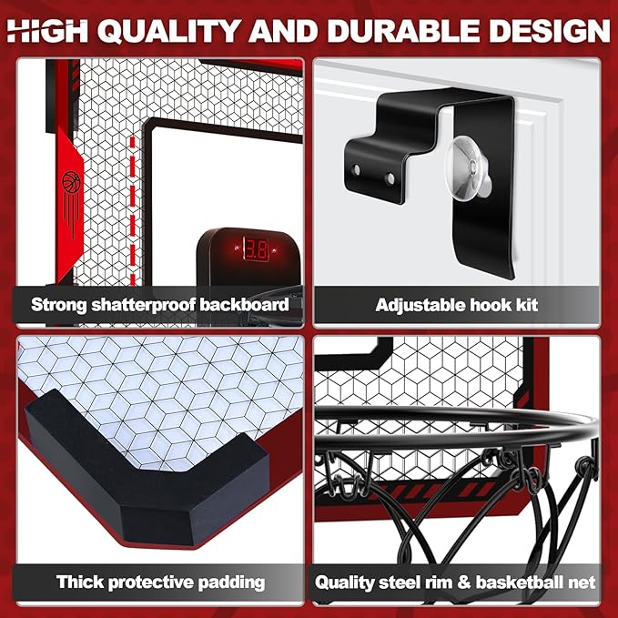- Basketball Hoop Set with Electronic Scoreboard: Our mini basketball hoop set includes 1 electronic scoreboard, 3 basketballs, 1 pump and 1 detailed instruction. Come with electronic scoring the score will be digitally calculated and automatically displayed. The electronic scoreboard has two modes, one is the scoring mode and the other is the countdown mode.The basketball hoop over door can not only bring joy to children, but also a good game for adults to relax in their daily work.