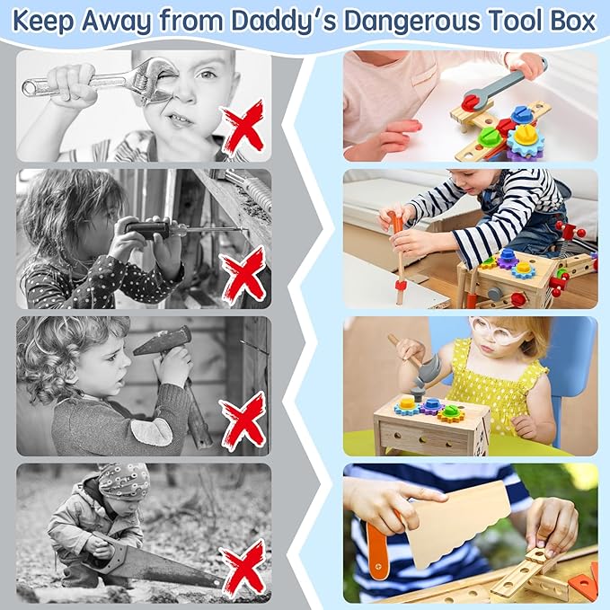 - 【Perfect Gifts for Kids】 Children are curious about new things, they love mom and dad's toolbox. If grandparents or parents want to give your baby a great gift, encourage to imitate mom and dad using tools with a safe wooden toolbox, satisfy the baby's curiosity, then our wooden toddler tool set is a good choice for baby 2 3 4 5 year old girls boys gift, suit for birthday, Halloween, Christmas, Thanksgiving, New Year, Children's Day and other holidays.