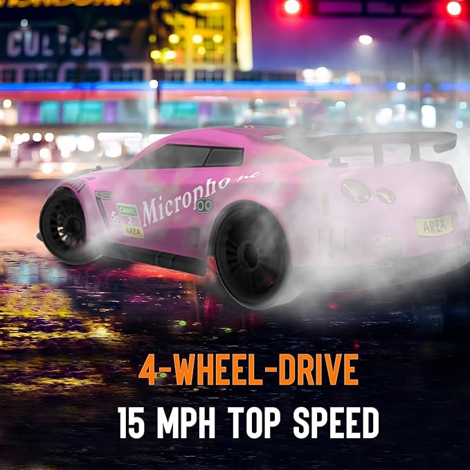 - [ 4 Wheels Drive Drift Remote Control Cars ] This drift kids car, equipped with 4 wheel-drive system system and powerful motors, has strong power and driving force. Let the remote control toy car to conquer different terrains or drift on road easil to bring you incredible driving experience. The led lights of toy car allows for nighttime playing.