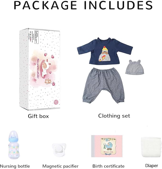 • What You Get: Lovely lifelike reborn doll x1, Clothes set as pictured x1, Feeding bottle x1, Magnetic pacifier x1, Birth certificate card x1, diaperx1, Gift box x1.
