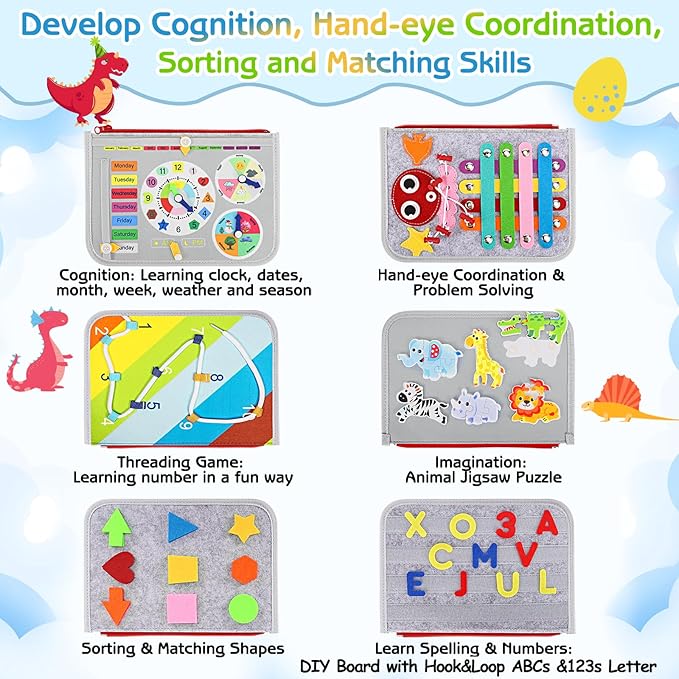 - [DECENT GIFT & SATISFACTION]: Esjay Montessori busy board for toddlers gifts is made with quality and care. Each parts are securely attached to the board and sturdy enough to hold up to toddler’ s use. The covers are printed with cute dinosaur pattern and animal alphabet, makes it a decent Christmas and birthday gift for toddler boys and girls.