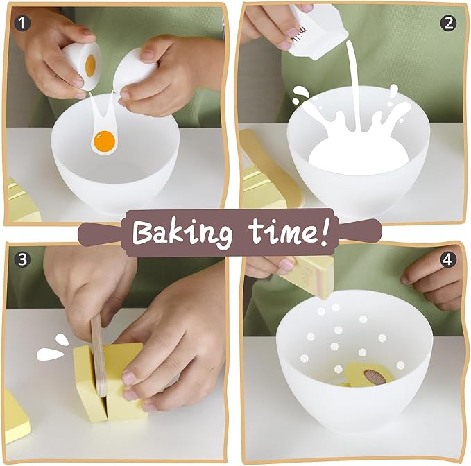 • WOODEN KITCHEN TOYS - All perfectly sized for little hands to hold, little bakers can develop hand-eye coordination and fine motor skills while they pretend to bake. It's a great addition to any playroom and a great toy for developing interest and socializing with kids.