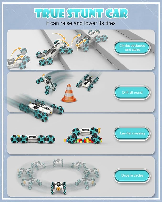 - Unique 8-wheeled Drift Car. In addition to the functions of forward, backward, left turn and right turn, the remote control car can also play stunts such as 360° rotation, circle, drift, crawl, and double-sided driving. Each pair of tyre arms can be operated individually, which can be rotated at different angles to elude the obstacle.