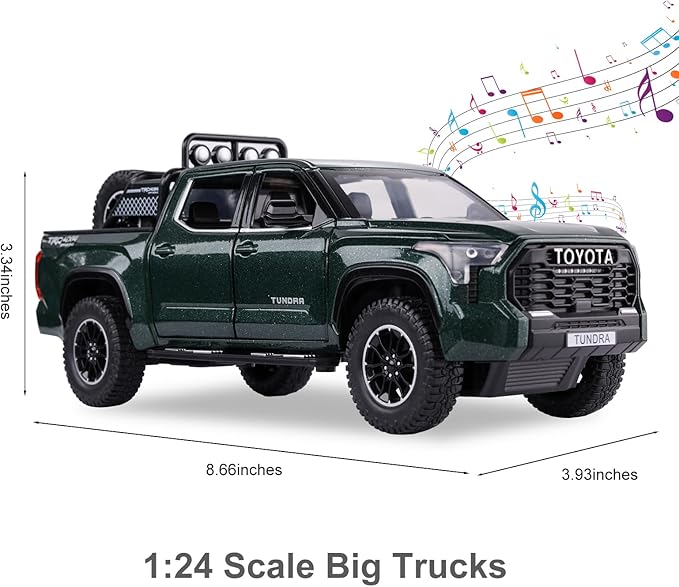 • [1:24 Big Tundra Toy Truck]: LxWxH (Inches): 8.66"x 3.93"x 3.34". It is a big trucks for boys age 4-7, there are 3 colors can be chosen from : red, green and white. Each color is so cool, it can not only be toy pickup truck, but also suitable for collectable car and truck or decoration