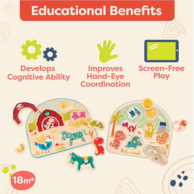 B. toys- Peg Puzzle 2-Pack - Dinos & Farm Animals- Wooden Peg Puzzles- 8 Pieces Each – Classic Toys for Toddlers, Kids – 18 Months +