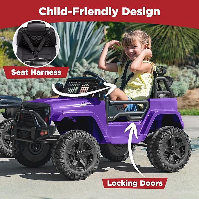 • POWERFUL 12V & REALISTIC DESIGN: Adjustable seatbelt, bright LED headlights, lockable doors, and grid windshield for off-road style, with a 12V motor and traction tires to ride on different terrains