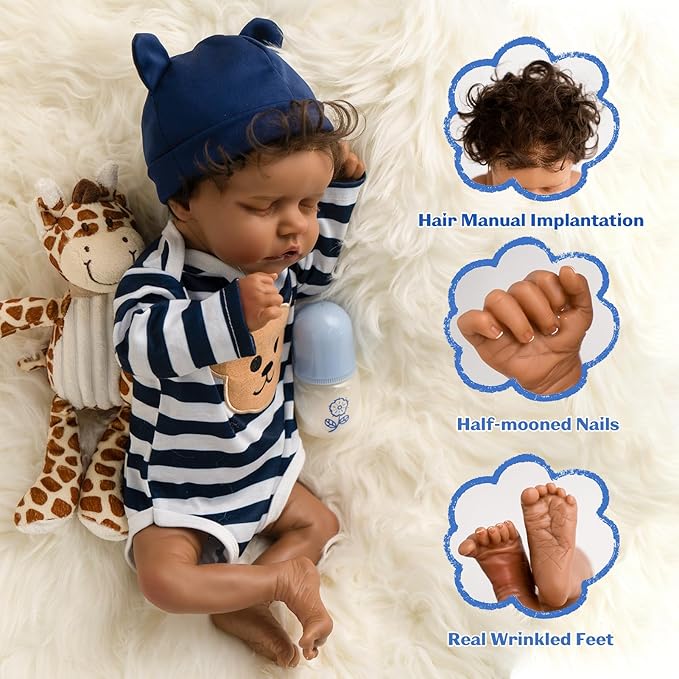 - Ideal Size for Little Arms: At 18 inches, the black reborn doll is just the right size for children to carry, cuddle, and tuck into bed. It's easy for little ones to handle and play with, whether they're playing house, taking their doll on imaginary outings, or simply enjoying a snuggle