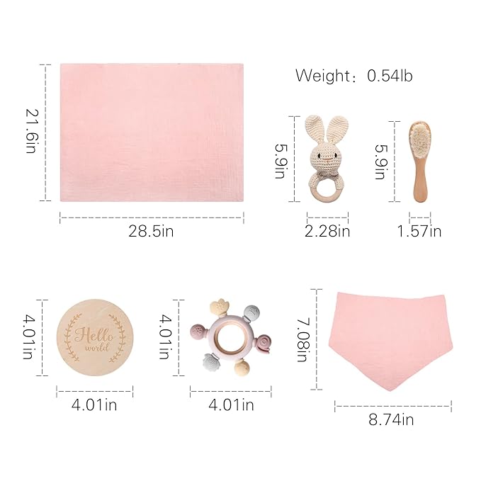 - 【Baby Gifts Basket Essentials】he thoughtfully curated set of hand picked items welcomes a precious newborn in style. This baby newborn essentials gift includes 1*Blanket (22x29 inches) which wraps your child in comfort, and keeps little ones feeling cozy and snug., 1*Teether, 1* Baby Milestone, 1*Hair Brush, 1* Rattle, 1*Drool Towel and Gift Box. She will absolutely love the gifts!