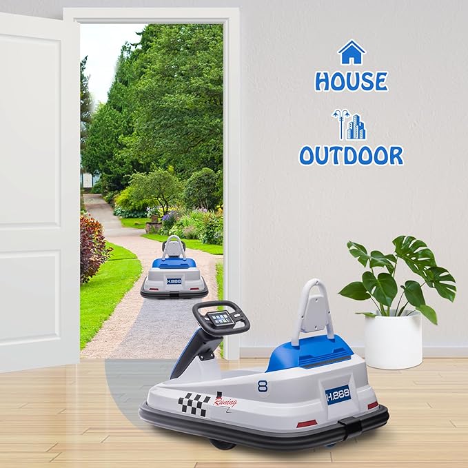 - 【Top Safety Features】The ride-on bumper car has an adjustable seat belt, anti-flat tires and sturdy plastic shell construction for a safer ride. This awesome electric vehicle has a soft PVC rubber anti-collision strip making it a safe ride on toy for your kids and protect walls and furniture.