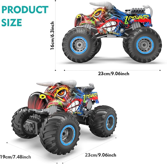 - 【Captivating LED Light Show】 Built-in three modes of lights and dynamic music, Illuminate the action with the vibrant LED lights that adorn our monster truck. Whether indoors or outdoors, the dazzling LED display enhances the play experience, creating a mesmerizing spectacle.