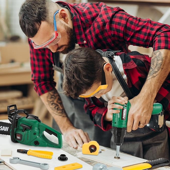 - 【36pcs Toy Tool Set & Great Gift for Kids】 Vextronic kids real tool set includes electric toy chainsaw, electric drill, cutting saw, circular saw, goggles, ear muff, mask, tape measure, hammer, pliers, screwdriver, file, wrench, screw, nut, nail and blocks. Kids are curious about parents fixing and building things, and Vextronic kids tool sets for boys age 3 4 5 6 7 8 offers a variety of kid tools, perfect for birthdays, Christmas, Thanksgiving, or any special occasion gifts for toddlers.