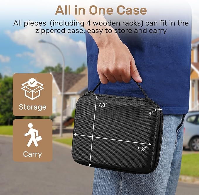 • Play Anytime, Anywhere: All pieces (including 4 wooden racks) can fit in the big zippered case, easily stored and carried out, perfect for travel or camping.