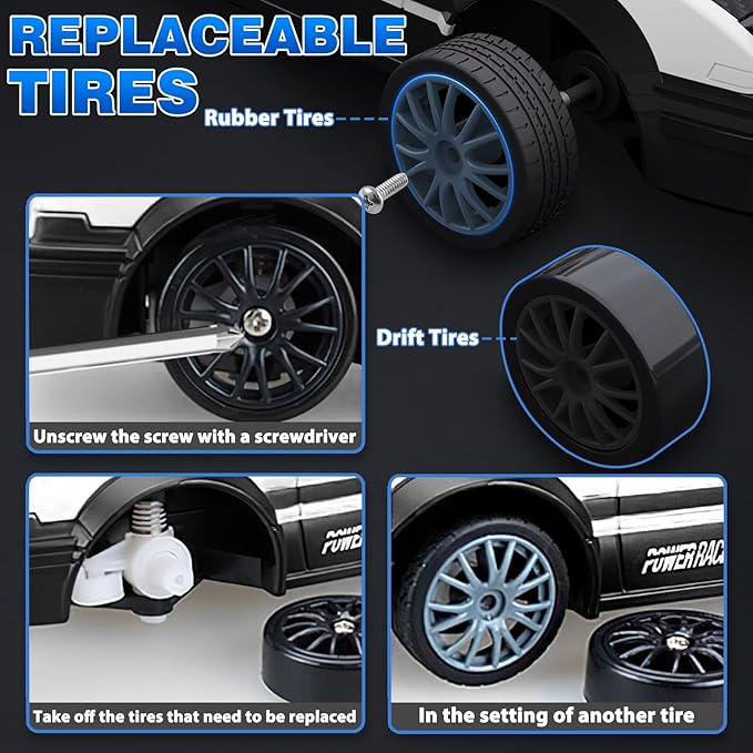 • Rechargeable Fast Car: Full function RC drift car with two rechargeable batteries. Don't worry about being out of charge anymore; Forward, reverse, left/right turn, front LED lights, U shaped drift, fiqure 8 drift, all-wheel drive