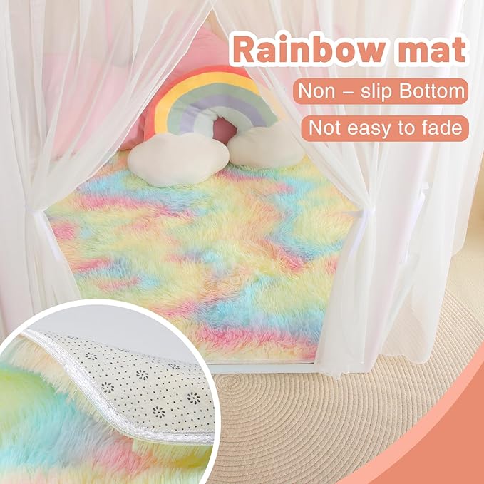 • Rainbow Floor Mat: Girls play tent comes with a rainbow plush rug. The fluffy mat is soft to the touch and comes with a non-slip backing design that fits perfectly in the castle and adds comfort to the little girl tent