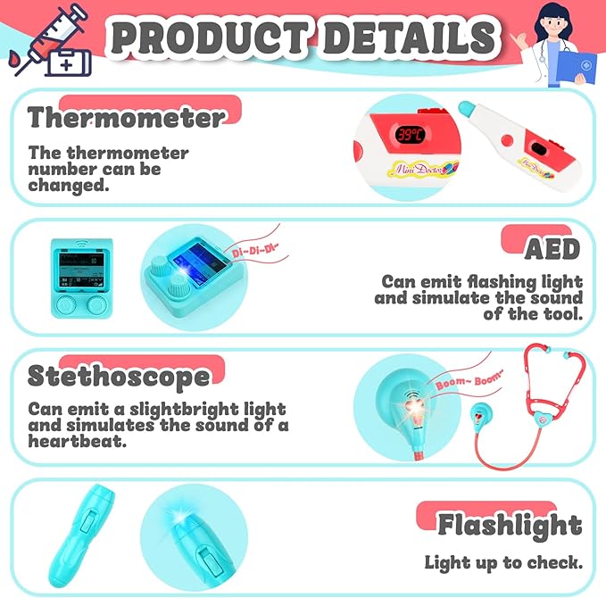 - Great Toyfor Kids-This kid's doctor set toy would be the good item for kids ages 3-8[Contains small parts, not suitable for children under 3 years old. Perfect for parties, Christmas, Halloween, school classrooms, holiday toy, birthday , and more occasions.
