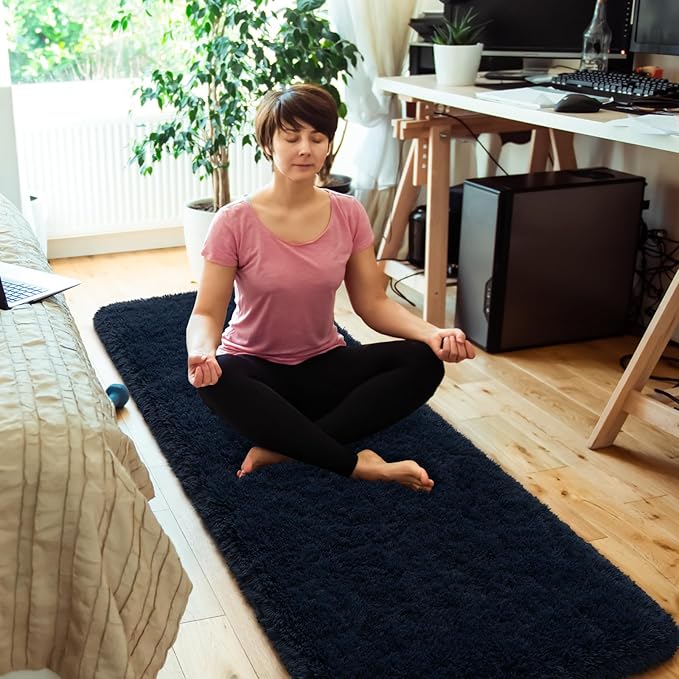 Amearea Shag Fluffy Runner Rug for Bedroom Girls Living Room, 2x6 Feet Extra Soft and Fuzzy Shaggy Rugs, Non Slip, Indoor Floor Long Carpet Mat for Boys Nursery Home Decor, Navy Blue