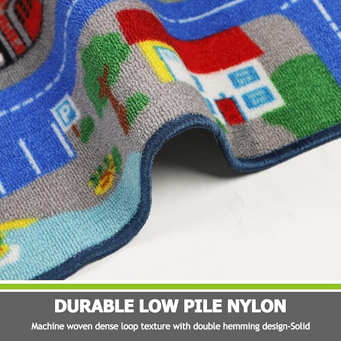 - 【Blue Car Road Kids Carpet for Playroom】:This traffic road rug is a clever combination of blue and gray,and decorated with multiple patterns such as police station,school,hospital,bookstore, laundry,fire station,church,gas station,bank,etc.So that children can learn a lot of knowledge while playing.