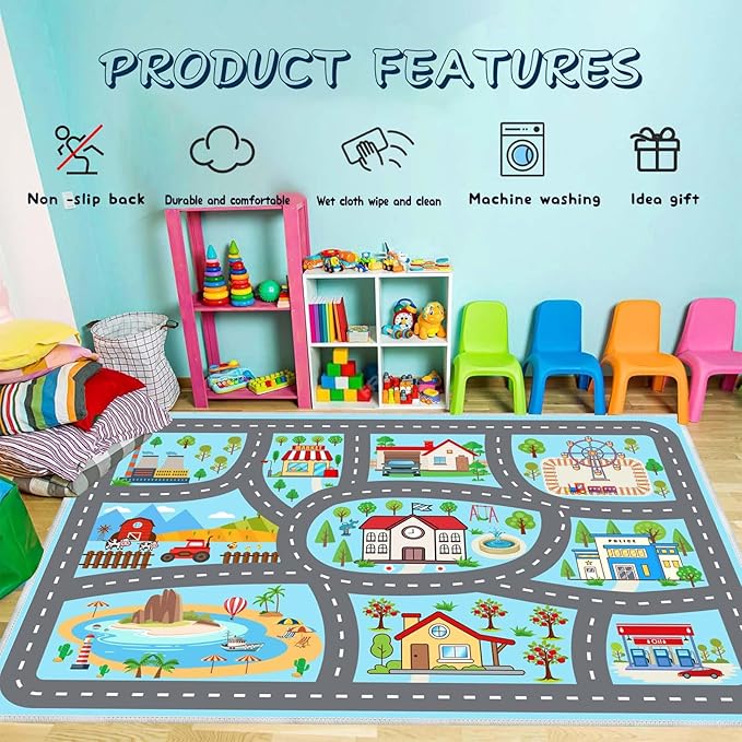 • 【Great Gift for Kids】This play rug is perfect for kids who like to play with wheel car toys, let boys and girls learn enlightenment while having fun, it is a good gift for kids.
