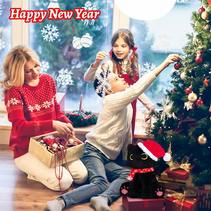 • Cute Christmas Plush Doll: The cute black cat plush toy comes with a Christmas hat and snowflake red scarf, waiting to meet and cuddle with you. Cute Christmas black cat plush accompanies you at night to keep you company