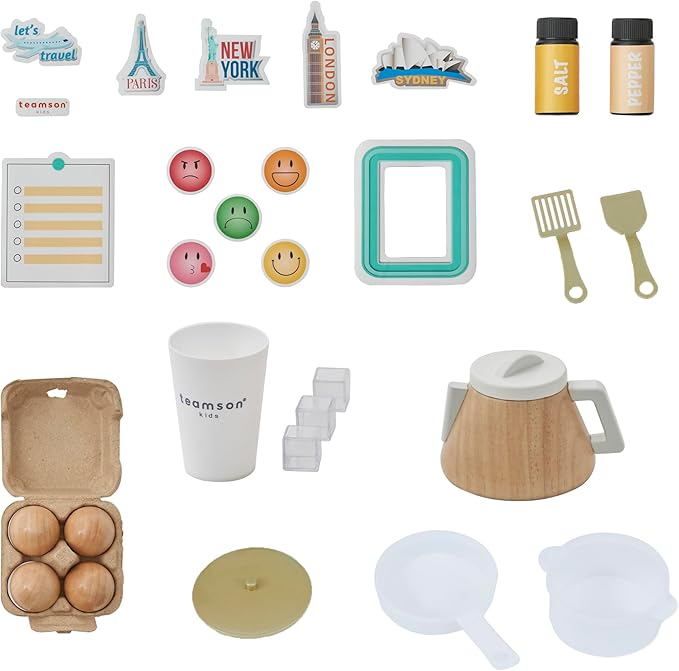 • (17) KITCHEN ACCESSORIES: a coffee pot, spatulas, pot & pan with lid, two seasoning bottles, a cup, three pretend ice cubes, 4 "crackable" eggs, two recycling bins and magnetic items for the refrigerator door