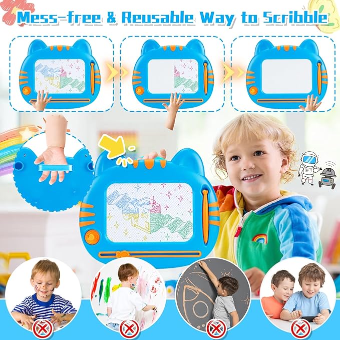 - Mess-Free & Reusable Doodle Board Boy Toys: The magnetic drawing board for toddlers 1-3 offers a clean and eco-friendly drawing alternative to using paper, crayons, pigments, ink, and pencils, ensuring a clean and hassle-free drawing experience for kids. The toddler drawing board features 4 vivid color zones (Red/Blue/Green/Yellow) to enhance a vibrant & engaging children's drawing. The smooth gliding eraser pole easily erases in a second for endless redraws, providing hours of drawing fun