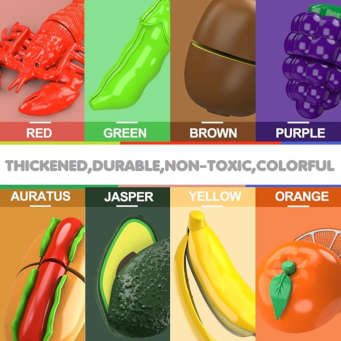 • 45 items pretend kitchen sets: 32 varies of play fruits, fast food and Vegetables(can be cut in 81 pieces and reattached), a grocery store basket, and play kitchen accessories. The kids can also experience the “peel” them like egg, corn, banana, crab...